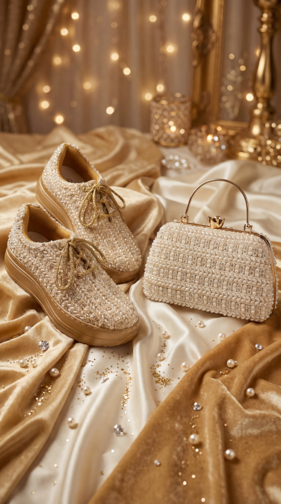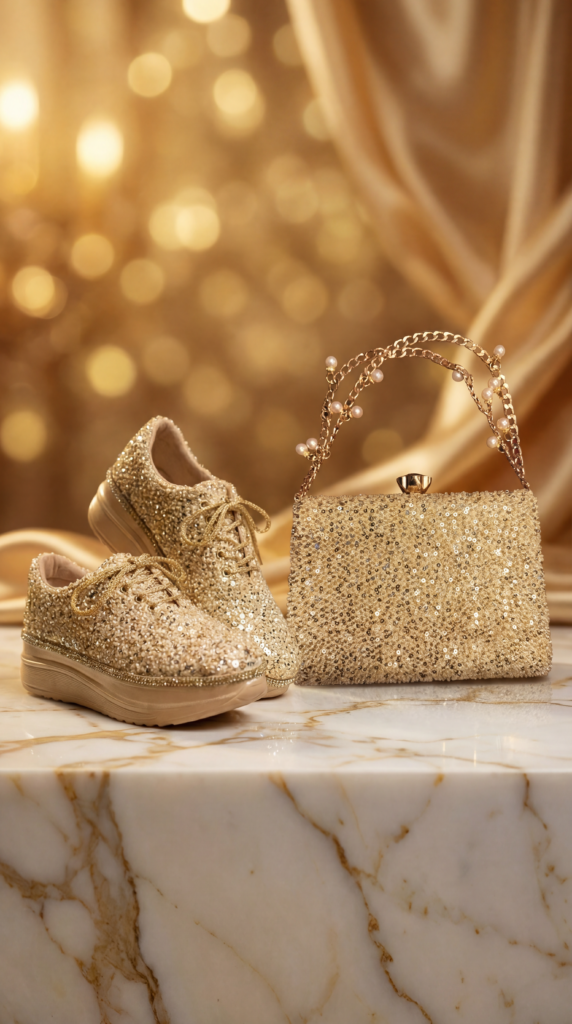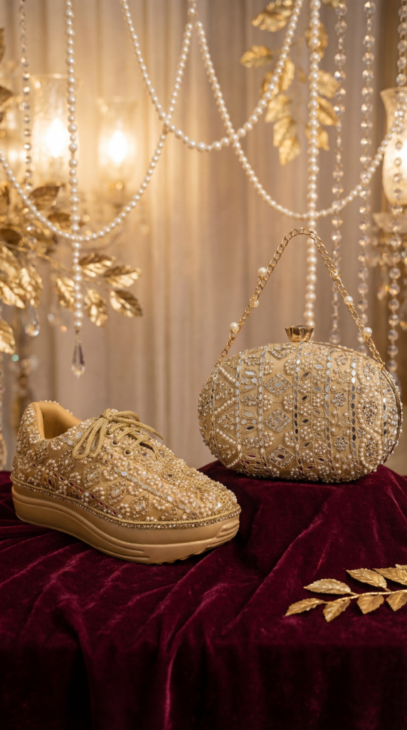 Luxe Pearl Mirror Sneaker with Designer Clutch – Heel height 2.2 inches approx