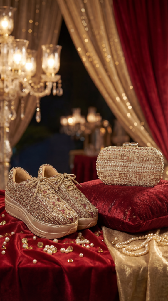 The Burgundy Gold Sneakers With a Designer Clutch – Heel height 2.2 inches approx