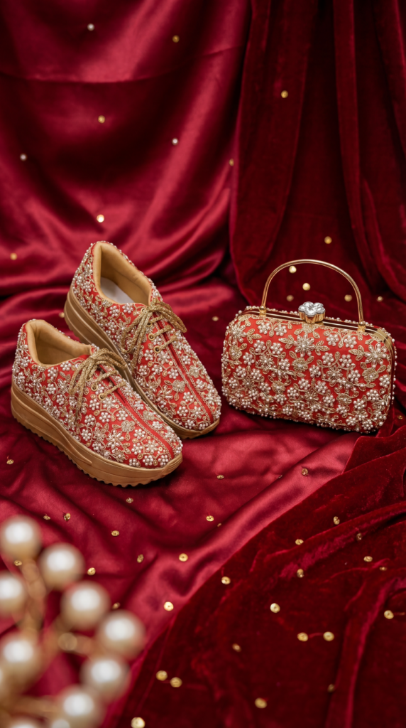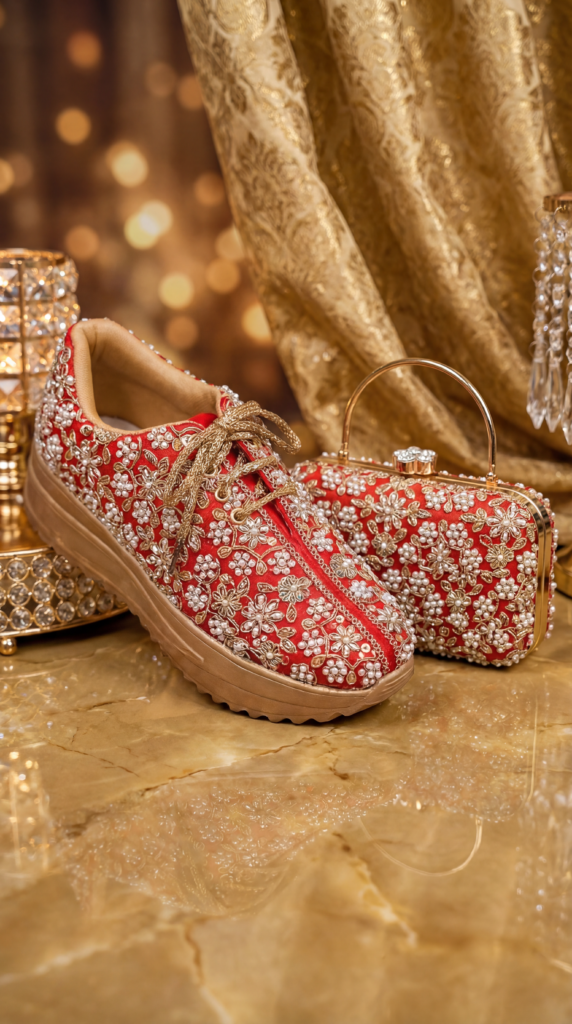 Kundanam Pearl Red Sneakers with Designer Clutch – Heel height 2.2 inches approx