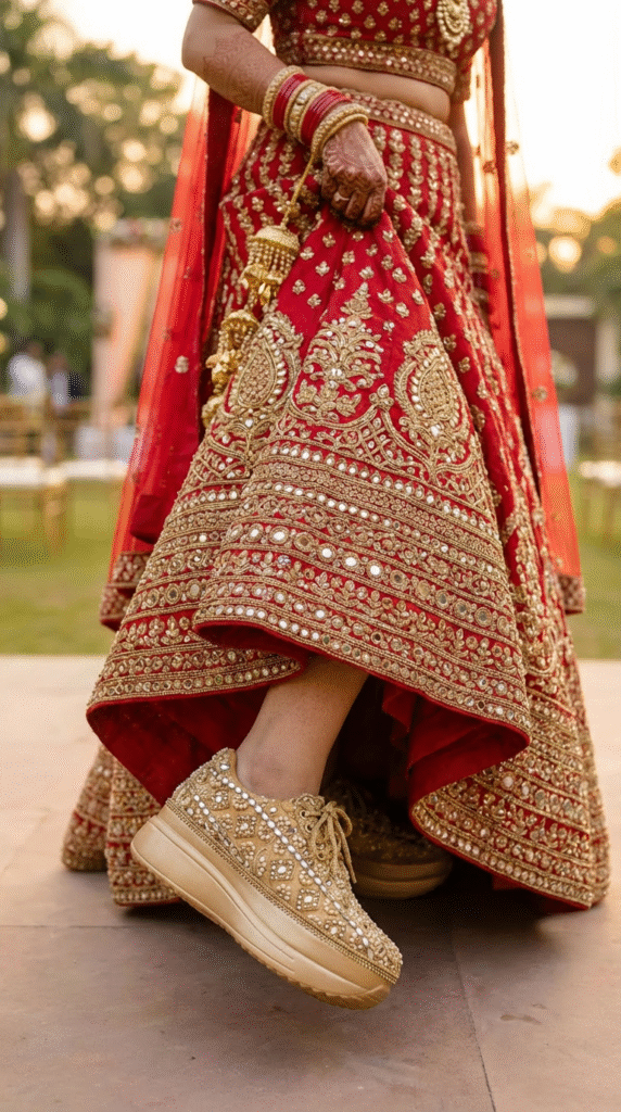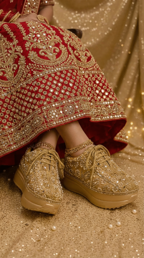 Designed with a cushioned sole and lightweight comfort, they let you dance, pose, and celebrate all day without compromising on style. Pair them with lehengas, shararas, sarees, or even fusion co-ord sets for a bold yet graceful statement look.